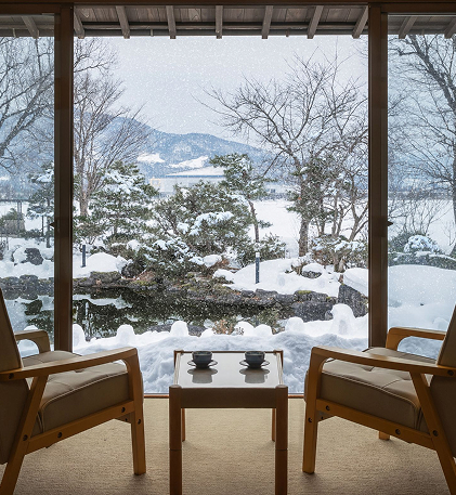 在宽敞的室内浴池和露天浴池中,一边放松身心,一边眺望藏王连峰——这一景色捕捉了山形风景的宁静之美。